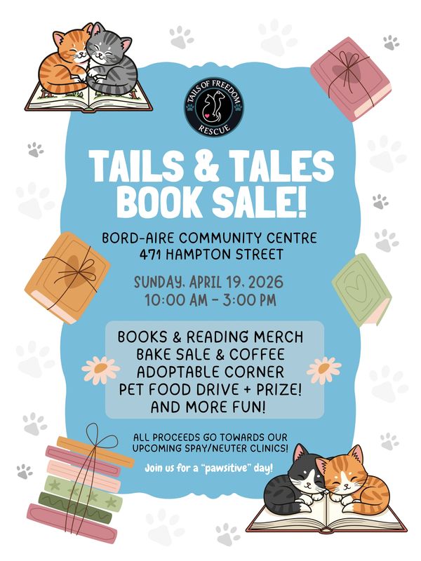 We are super excited to announce our 2026 Tails & Tales Book Sale! Join us for relaxing day at Bord-Aire Community Centre, where you can unwind with a cup of coffee or tea, indulge in baked goodies, and explore a vast array of books. Our kitty corner will offer the opportunity to get your snuggle fix in! 🐈