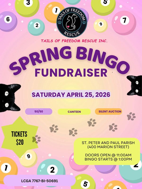 Join us for one of our most popular fundraisers of the year, BINGO! 😻 100% of the proceeds go towards helping spay & neuter fur babies! We will have a canteen, silent auction & 50/50! You do not want to miss out on this one!