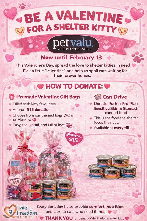 We have partnered up with Pet Valu Rivergrove for a special Valentine’s Day fundraiser for our kitties! Shelter & in care!